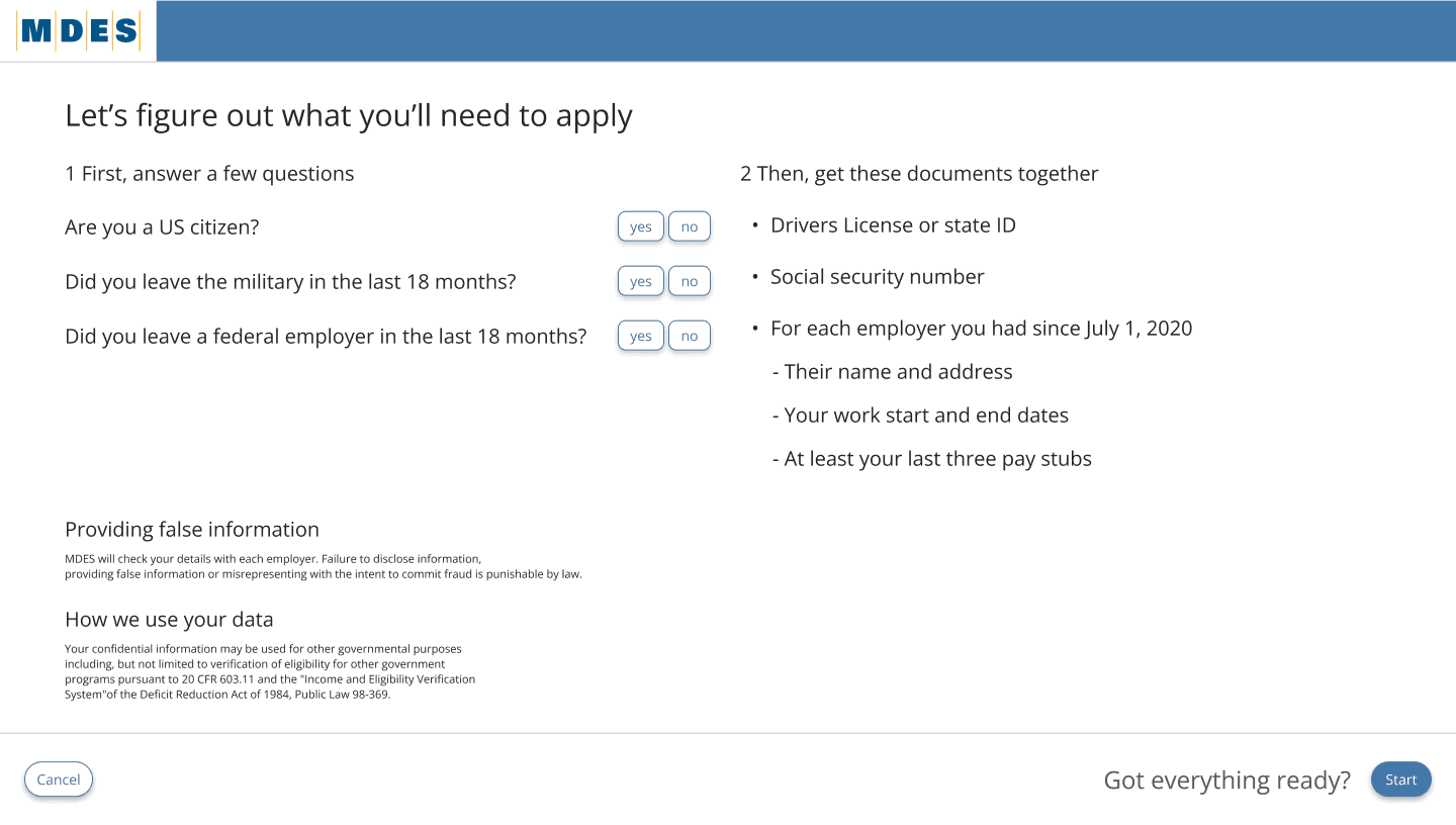 Apply for unemployment: Needs clear entry point and checklist.