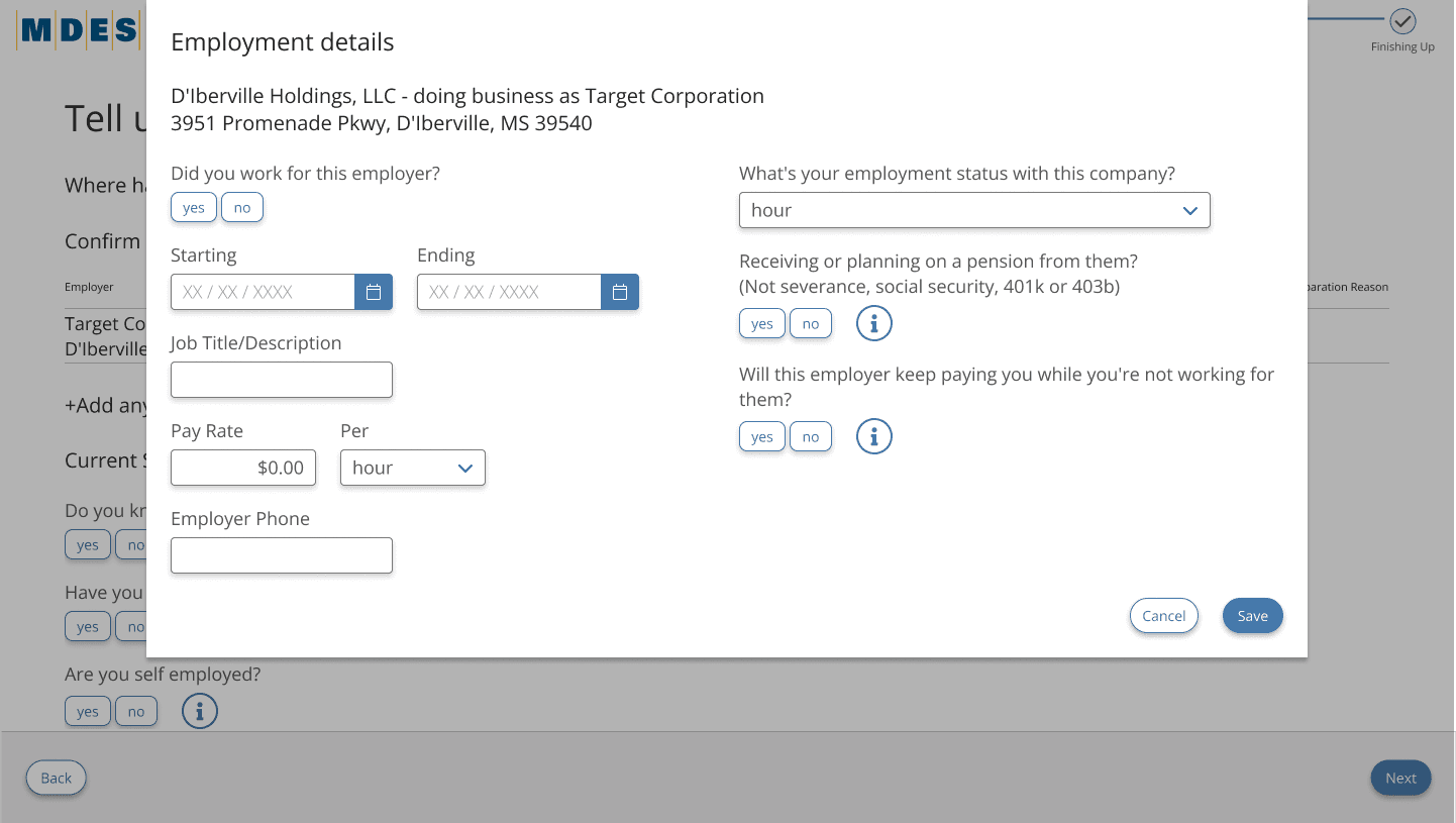 ReEmploy USA is an unemployment assistance platform used by multiple U.S. states, including Mississippi, Maine, and Connecticut. During the COVID-19 pandemic, these states experienced a dramatic increase in unemployment claims, exposing major usability issues in their legacy system, which was full of redundant screens, outdated flows, and unclear instructions.